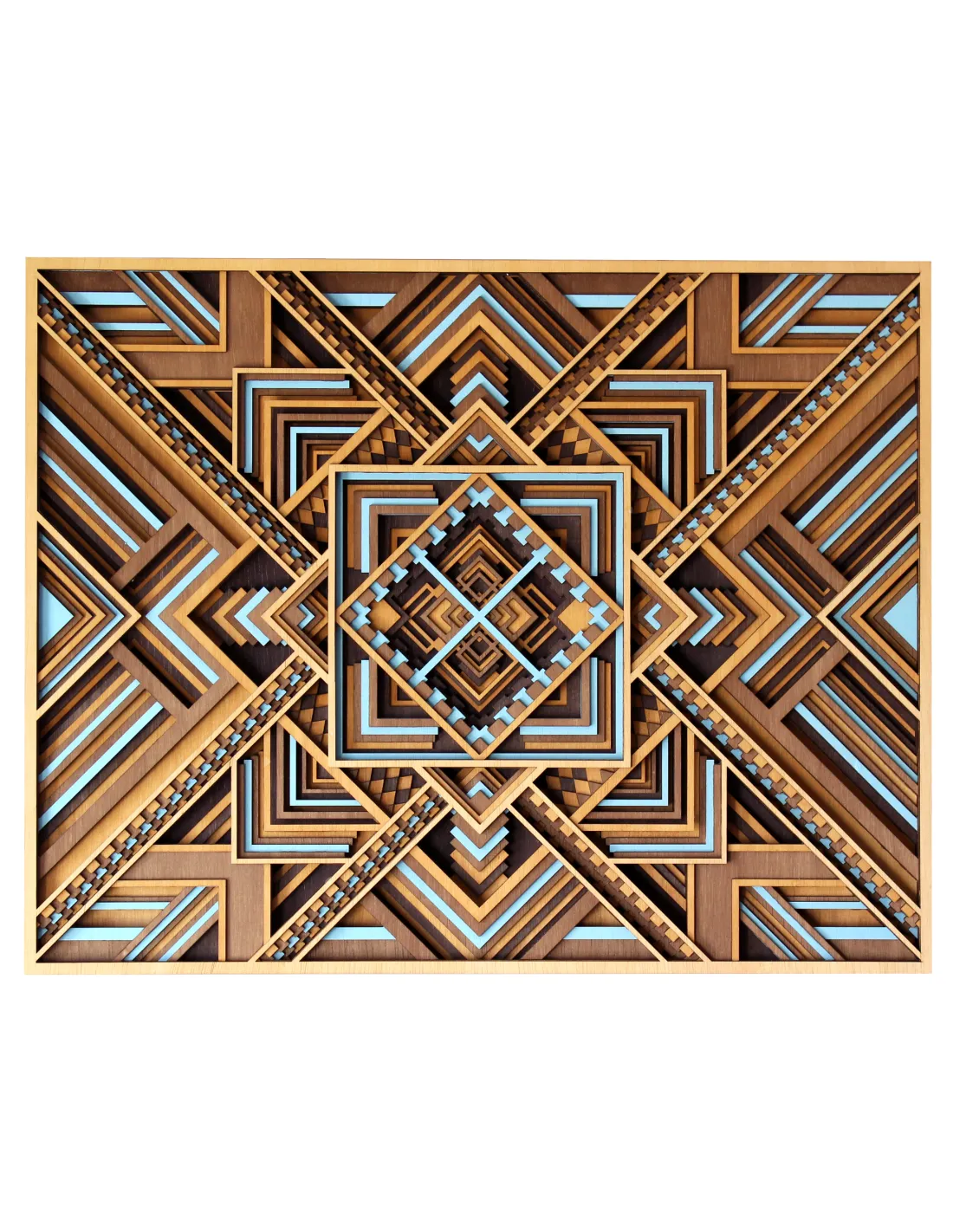 Manufactured in our Polish workshop with engineering precision, it mesmerizes with perfect proportions. Cascading layers delight with the depth of dark browns, the warmth of light wood, and a vibrant turquoise accent.