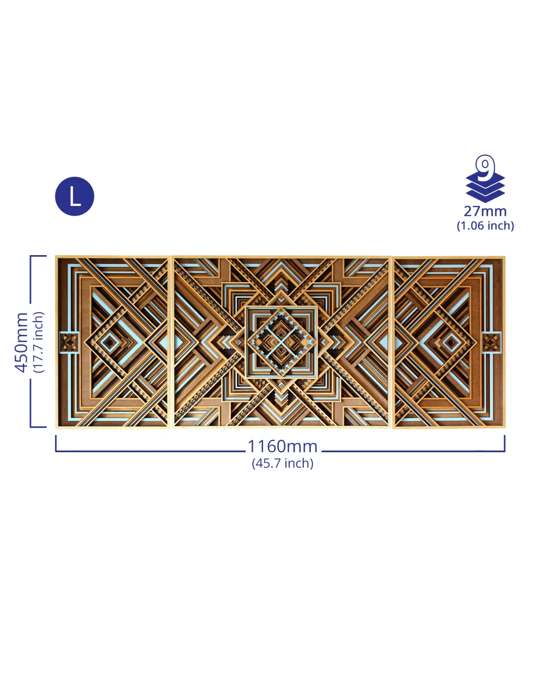 Wyprodukowany w naszej polskiej pracowni z inżynieryjną dokładnością, hipnotyzuje perfekcyjnymi proporcjami. Kaskadowe warstwy płynnie przechodzące przez trzy panele zachwycają głębią ciemnych brązów, ciepłem jasnego drewna i wibrującym, turkusowym akcentem.